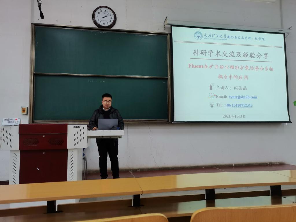 2021年1月3日下午14:00,PA视讯官方网站在明向校区行知楼B119举办了第三届研究生安全学术交流会。本次交流会由公司刘红威老师主持,安全科学与工程专业博士研究生闫晶晶作学术报告。会议邀请了高亚斌老师作为点评专家。全院200多名研究生参加了此次学术交流会。