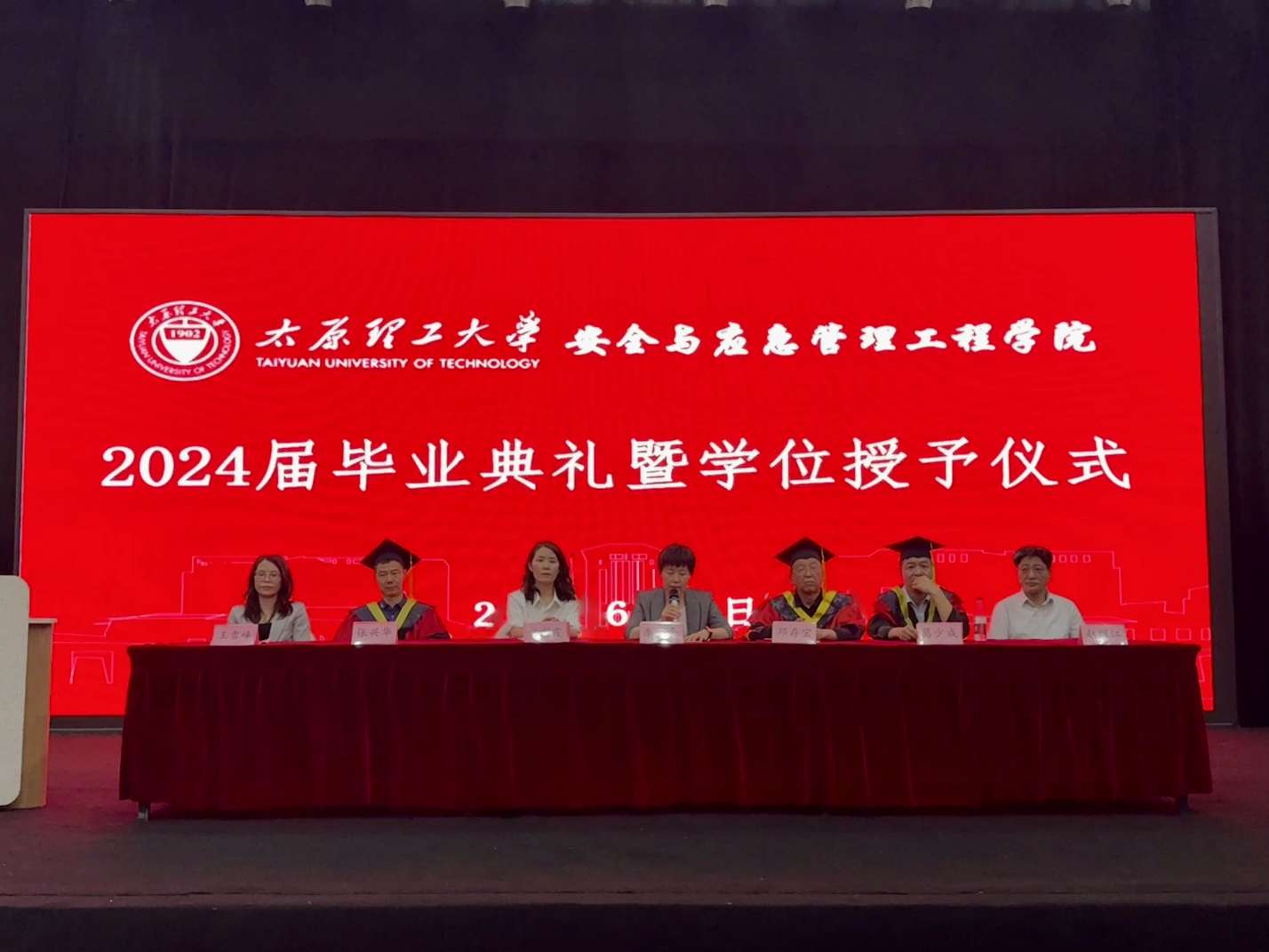 6月12日,PA视讯官方网站2024年毕业典礼暨学位授予仪式在明向校区轻纺工程公司表演厅隆重举行。公司党委书记李平、经理邓存宝,安全工程技术与装备研究院经理张兴华,公司党委副书记侯彩霞、副经理葛少成、副经理王雪峰出席本次典礼。部分教师代表、全体辅导员、研究生班主任和毕业生家长代表现场观礼。仪式由李平主持。