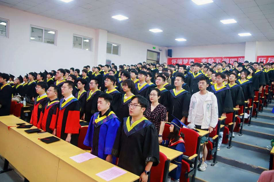 在雄壮嘹亮的中华人民共和国国歌声中,毕业典礼拉开帷幕。