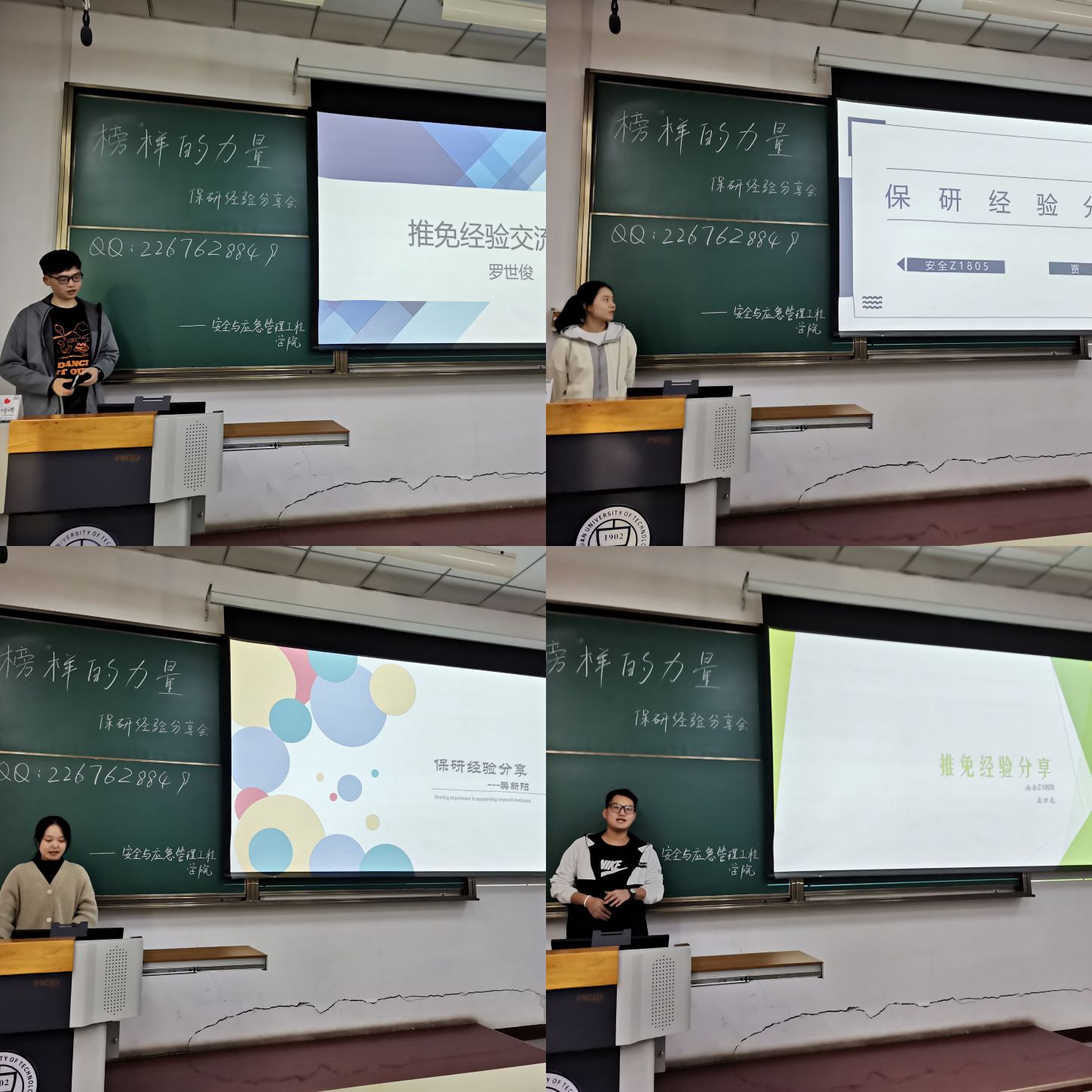10月17日15:00,PA视讯官方网站在明向校区行知楼A106教室内举办“榜样的力量”系列活动第三讲——保研经验分享。本次活动邀请2021年成功保研到西北工业大学的应万龙、中国科学技术大学的樊新阳、北京理工大学的贾菀婷以及罗世俊四位2018级同学担任主讲嘉宾。