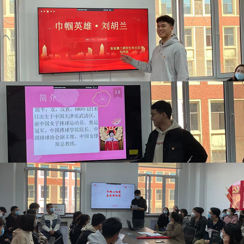 2023年3月8日上午,安全第二研究生党支部在公司307组织了主题为“巾帼心向党、奋进新征程”的主题党日活动。支部党员代表靳靖宇、刘雨豪、王成博三位同志分别讲述了“杨开慧、刘胡兰、郎平”三位巾帼英雄的英勇事迹及勇敢拼搏的精神。随后全体党员重温入党誓词,面向党旗庄严宣誓。支部书记鄂小雪进行了总结,强调要铭记历史,砥砺初心使命,作为新时代的员工党员,要继承和发扬她们不畏艰难、勇于奉献的精神,扎实提升自己的本领,为建设社会主义现代化国家贡献智慧力量。